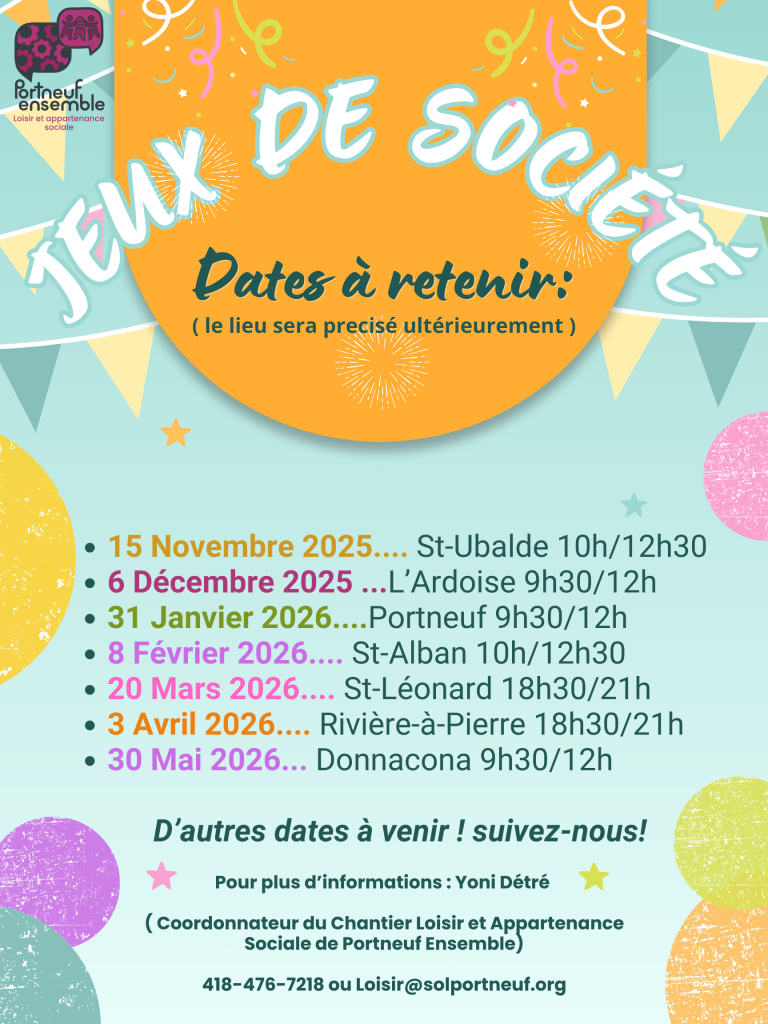 Voici les dates à retenir pour les événements jeux de société de Portneuf Ensemble. Nous communiquerons sur les lieux exactes d’ici quelques temps mais vous pouvez déjà placer sur votre calendrier ces évènements à ne pas manquer !! D’autres dates suivrons alors suivez-nous !!!!