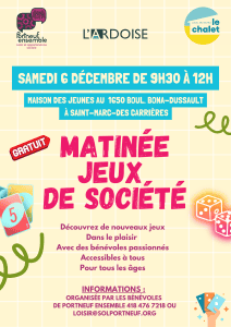 Voici un bel évènement à ne pas manquer ! l’évènement jeux de société de Portneuf Ensemble avec l’Ardoise. C’est le samedi 6 décembre de 9h30 ...