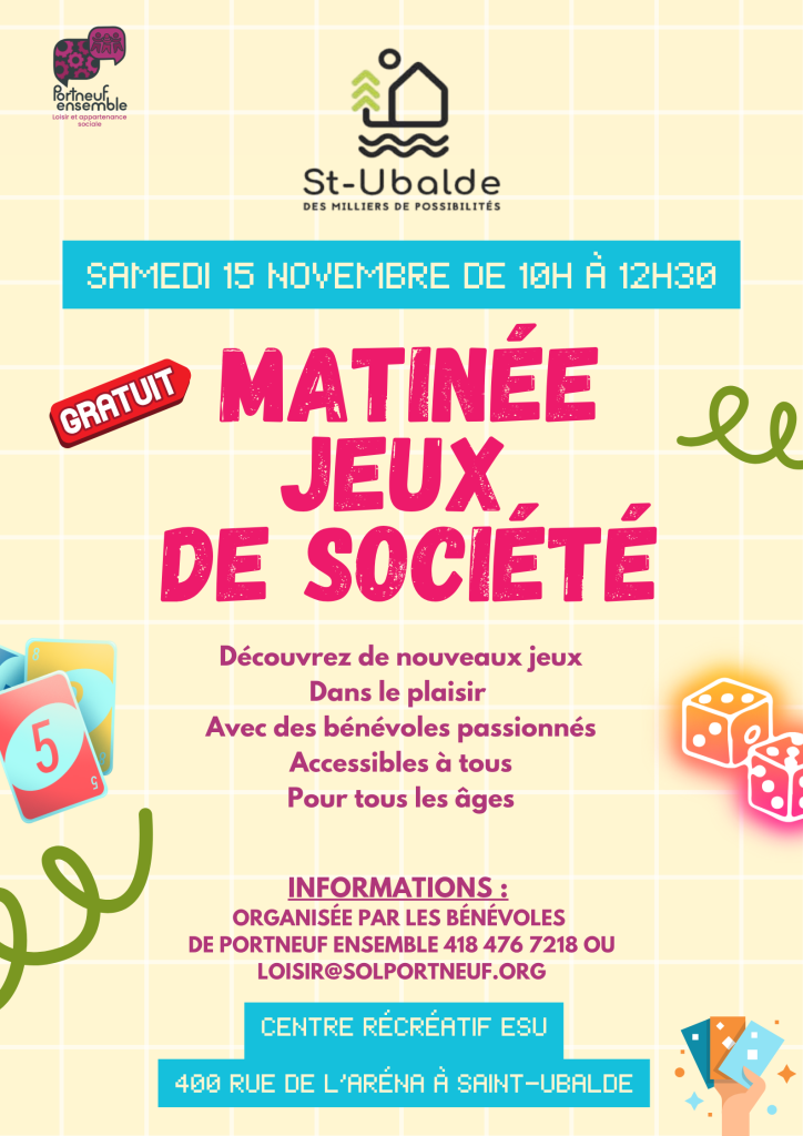 Bonjour, notre prochain événement de jeux de société de Portneuf Ensemble se déroulera le samedi 15 novembre de 10h à 12h30 à St-Ubalde au Centre Récréatif ESU – Dans la salle Dolbec, 400 rue de l’aréna, Saint-Ubalde, Québec, G0A, 4L0.