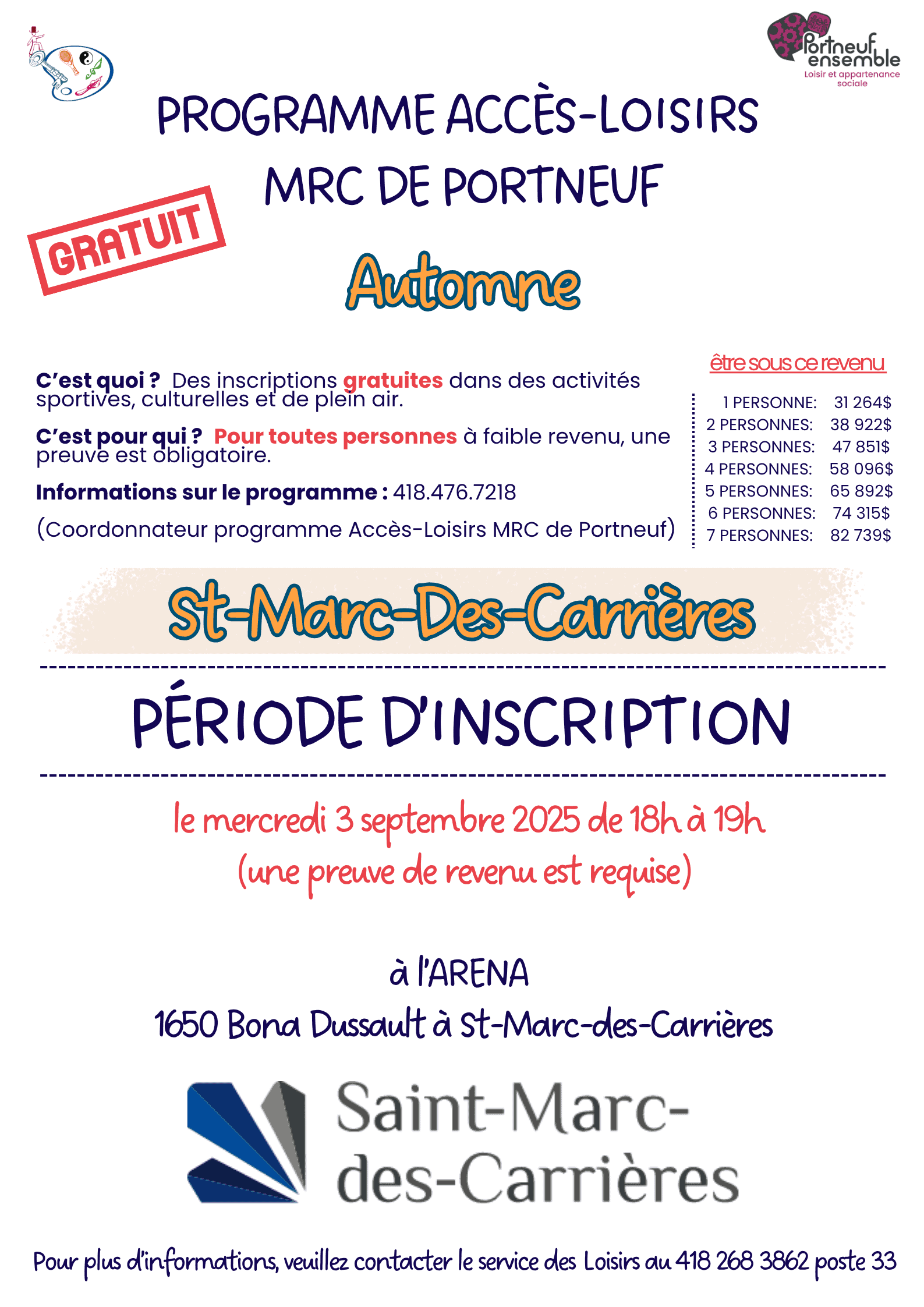 Voici l’ensemble des dates et lieux où nous serons presents dans le cadre des inscriptions au programme Accès-Loisirs MRC de Portneuf.